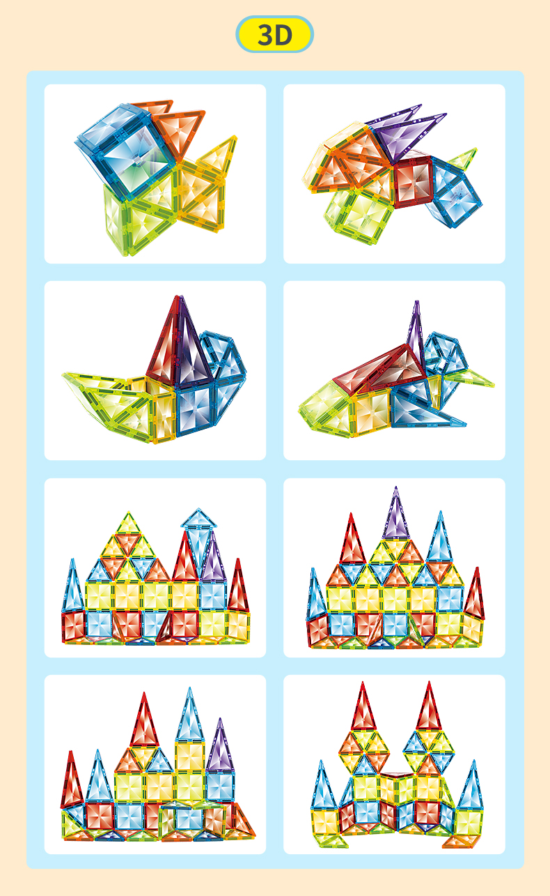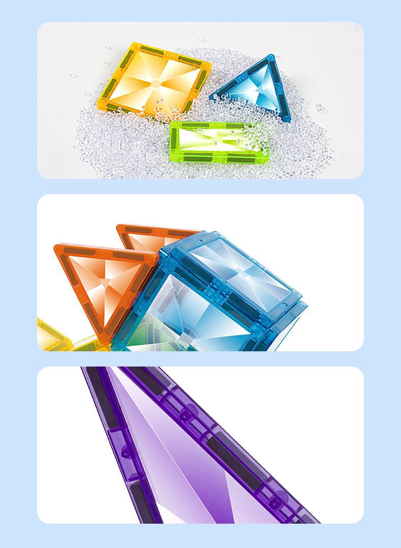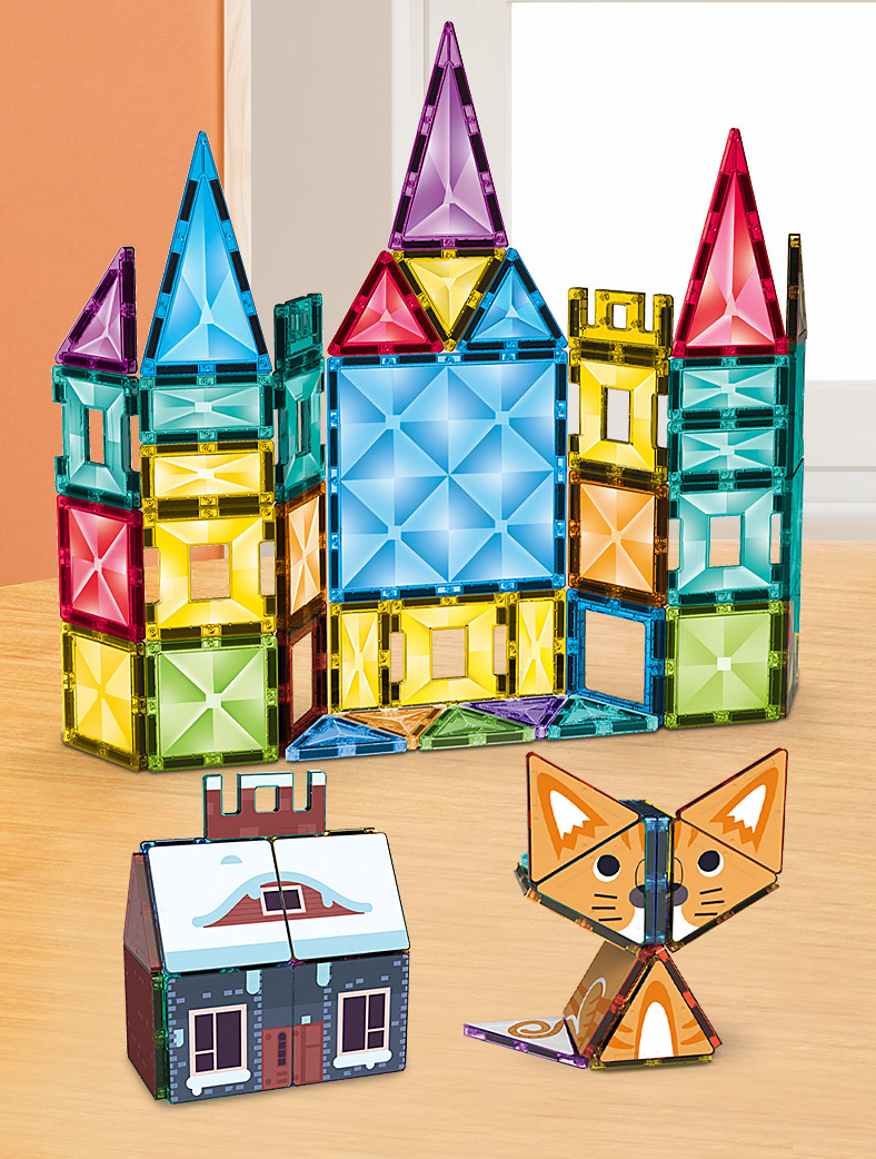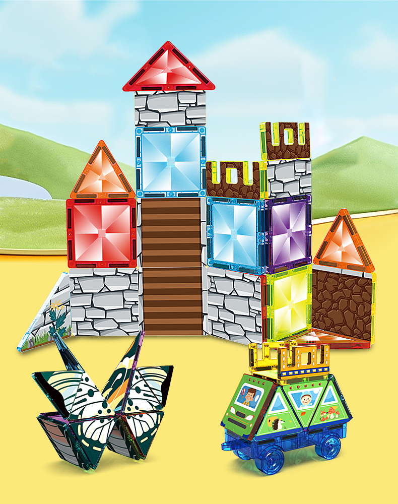 Die Elemente lassen sich dank starker Magnete leicht verbinden, sodass Kinder verschiedene Formen, Häuser, Türme, Burgen oder originelle Kunstwerke erschaffen können. Die Magnetbausteine verbinden Spaß, Kreativität und Ästhetik und fördern die Feinmotorik, Vorstellungskraft und den Sinn für Schönheit.